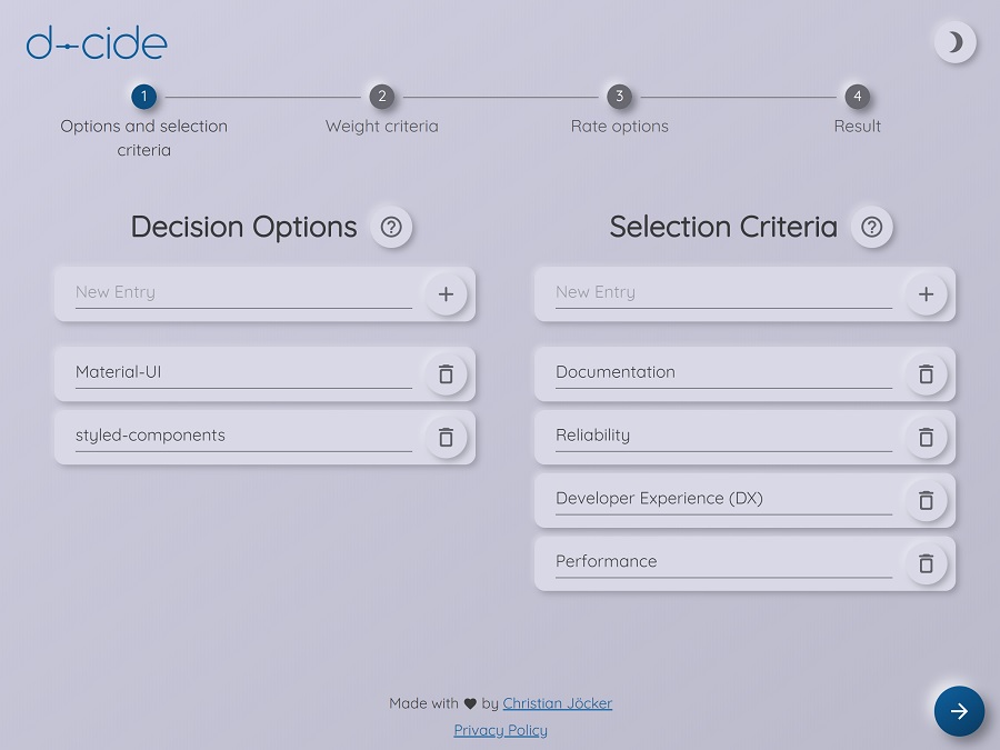 A progressive Web App to make rational decisions in workshops. It uses MUI with a neumorphic custom theme.
